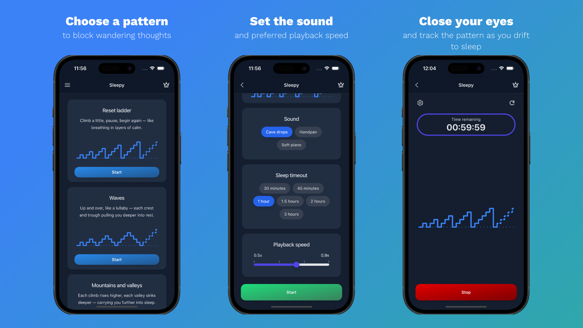 Sleepy guides you to visualize purposefully crafted audio patterns in your mind to help you fall asleep faster. By keeping your thoughts engaged, your busy mind tires and naturally drifts into sleep which helps you calm racing thoughts and ease insomnia.